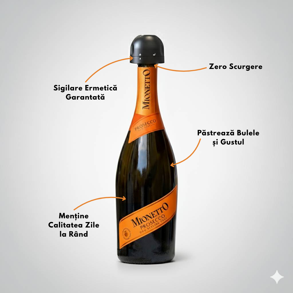 Prin optimizarea structurii interne, un mini sigilant face ca dopul de șampanie/vin să se potrivească perfect și blochează etanș gazul din sticlă pentru a preveni bulele să se disipeze încet după deschiderea sticlei de șampanie.